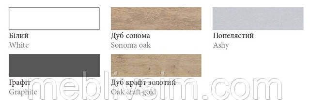 - корпус : ДСП - білий, дуб сонома, дуб золотий, попелястий та графіт