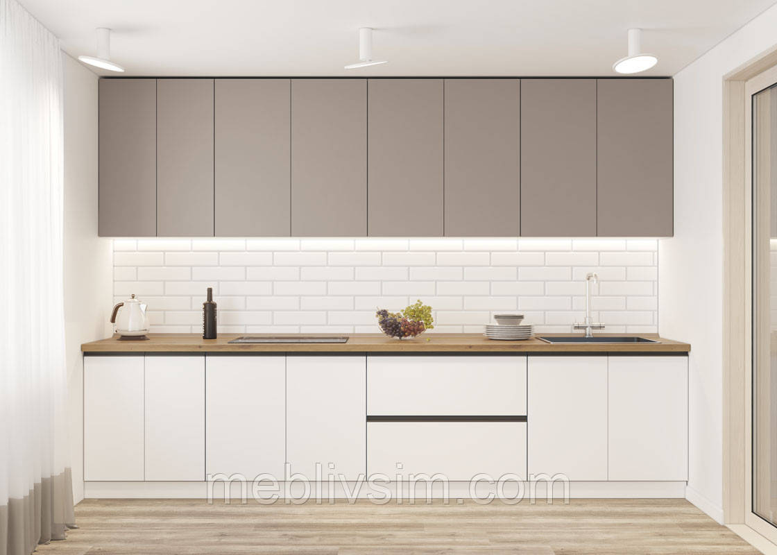 Ціна вказана за комплект розміром 300см: 60н2д, 80н2д, 80н2ш, 80низ мийка, 60в2д, 80в2д-3шт. Колір корпусу білий, колір верхніх фасадів "глиняний сірий", колір нижніх фасадів "білий". Стільниця (28мм) - дуб сонома, розміром 300см.